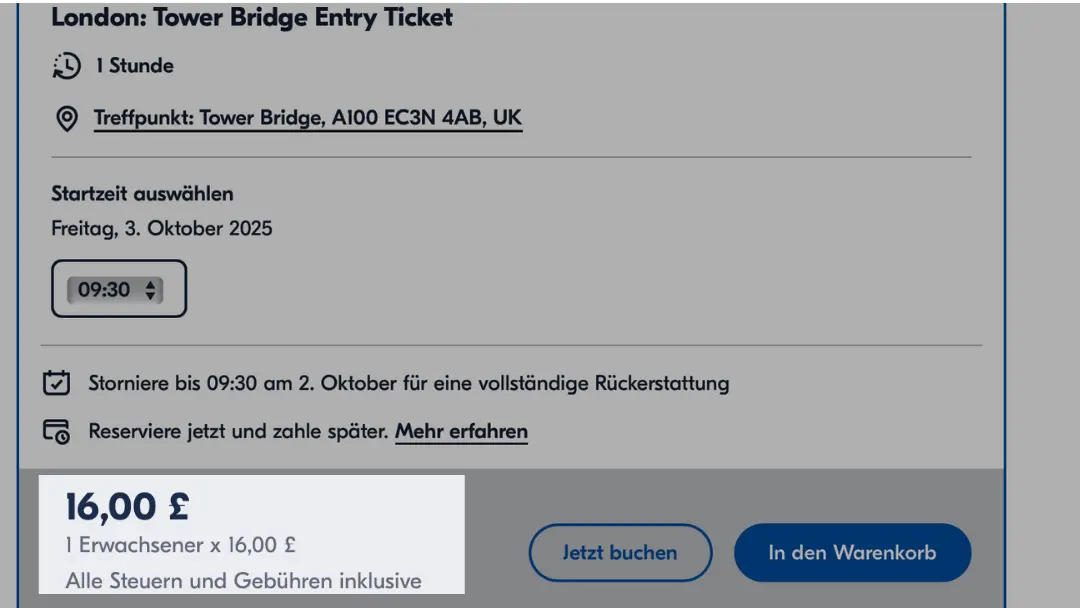 Wichtig: Es gibt eine Buchungsfrist. Um sicherzugehen, dass du an deinem Wunschtermin die Tower Bridge besuchen kannst, empfiehlt es sich, die Tickets jetzt zu kaufen.